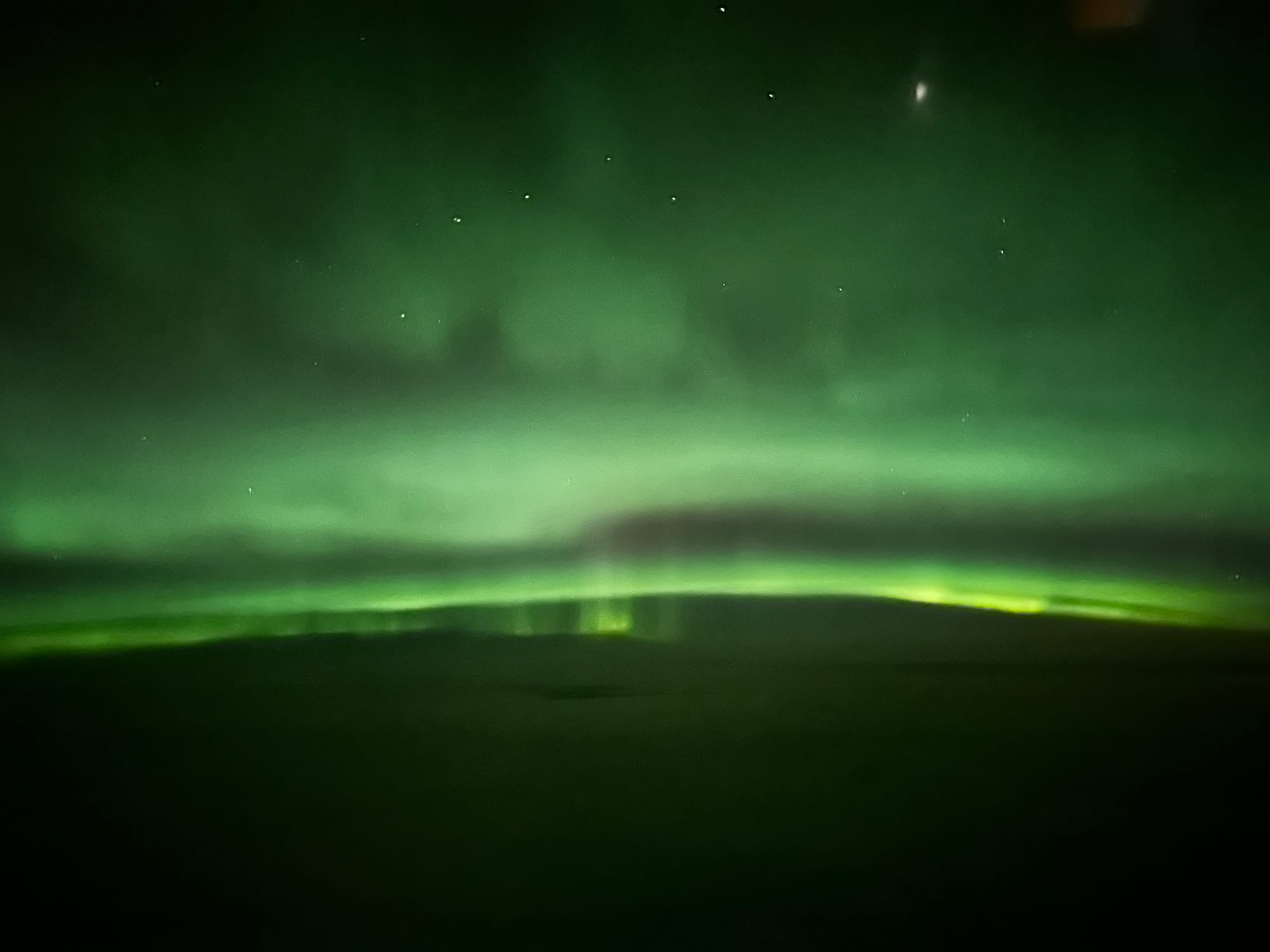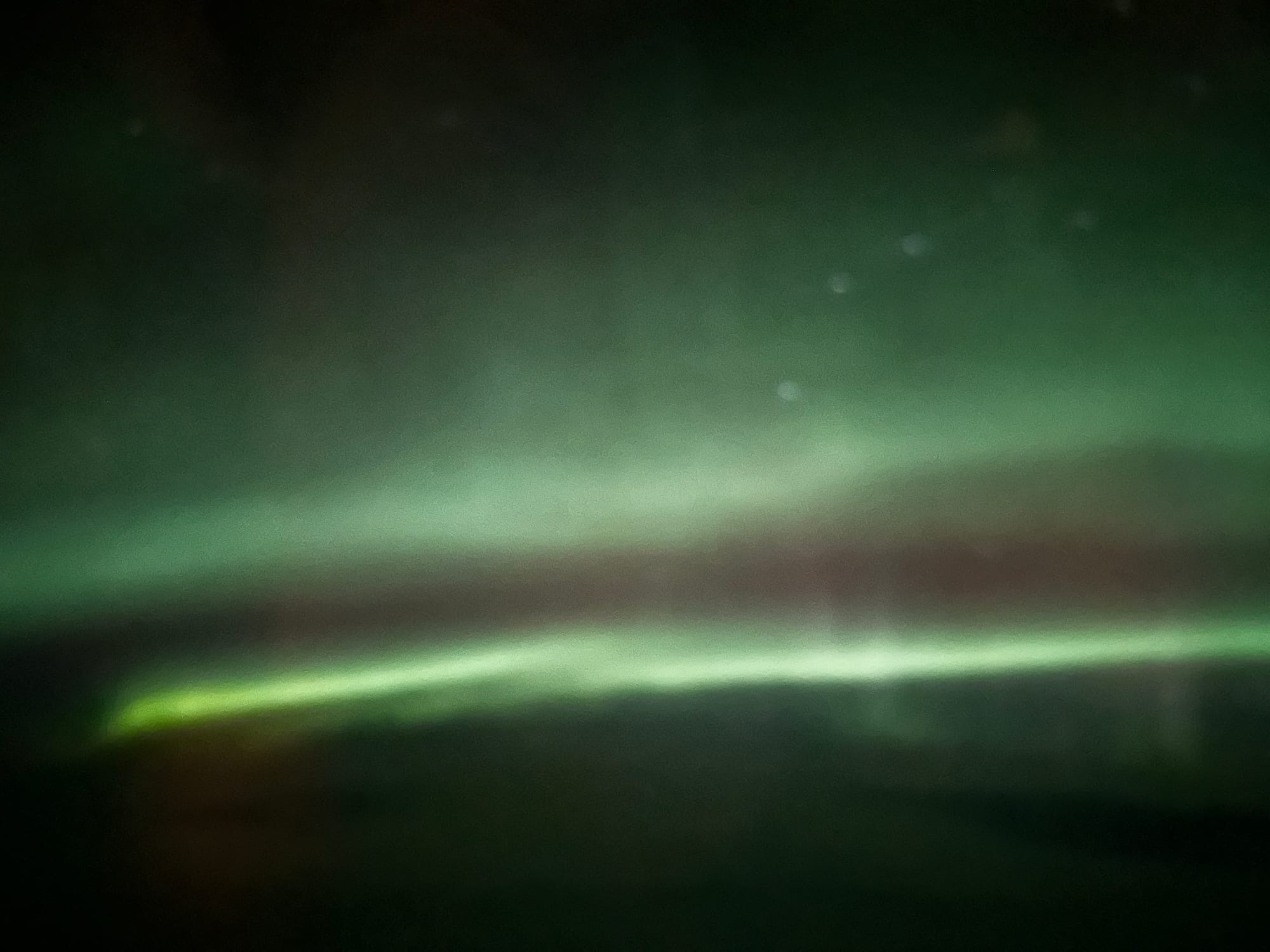 On my first Pacific crossing, another First Officer (and good friend!) pointed out the Northern Lights to me. I was a little let down, and at first I didn’t believe him. It more or less looked like a silver cloud along the horizon, “but it shows up better with a phone camera.” So I pointed and let the iPhone’s long exposure happen, revealing a pathetic wisp. Bummer.